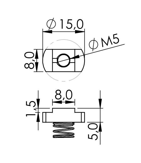 T-moer met veer voor een E groef, voor een moer-type verbinding.