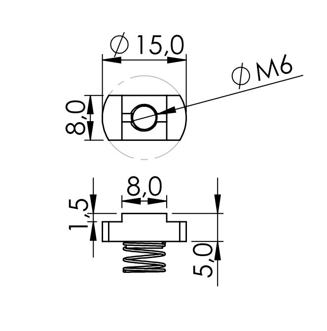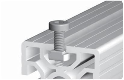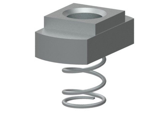 T-moer met veer voor een E groef, voor een moer-type verbinding.