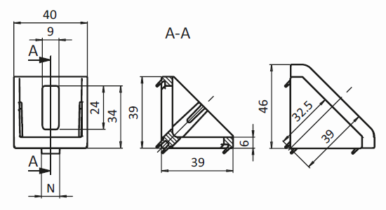 Montagehoek voor het ondersteunen van profielen en de montage van verschillende componenten.