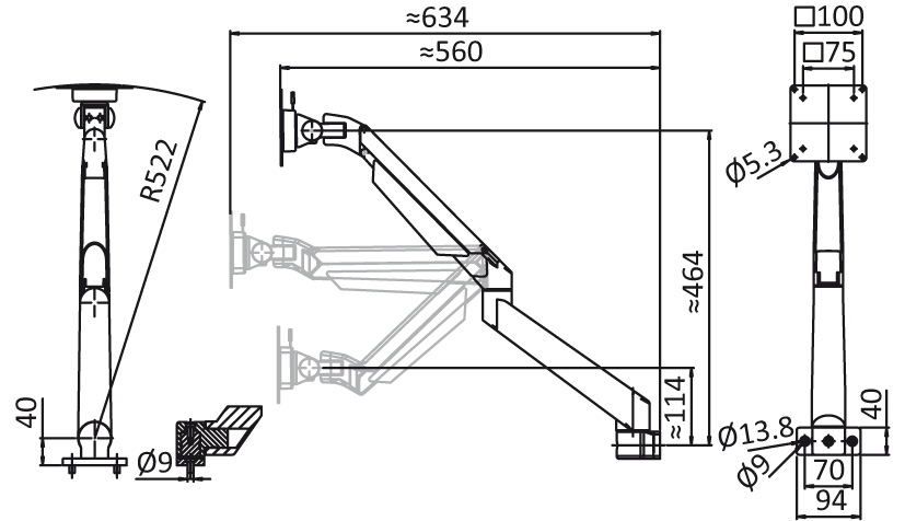 voor montage van verstelbare monitoren van 2 – 10 kg, montageplaat VESA MIS-D 75/100 compatibel; instelbare kijkhoek en hoogte, scherm draaibaar 90°; 360° montageflens voor horizontale en verticale bevestiging met bevestigingsadapter |
