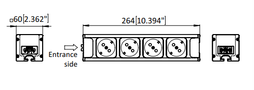 Stekkerdoos met contacten voor stroom toevoer op werkstations. Op de achterkant een mechanisme voor monteren op onze aluminium profielen.